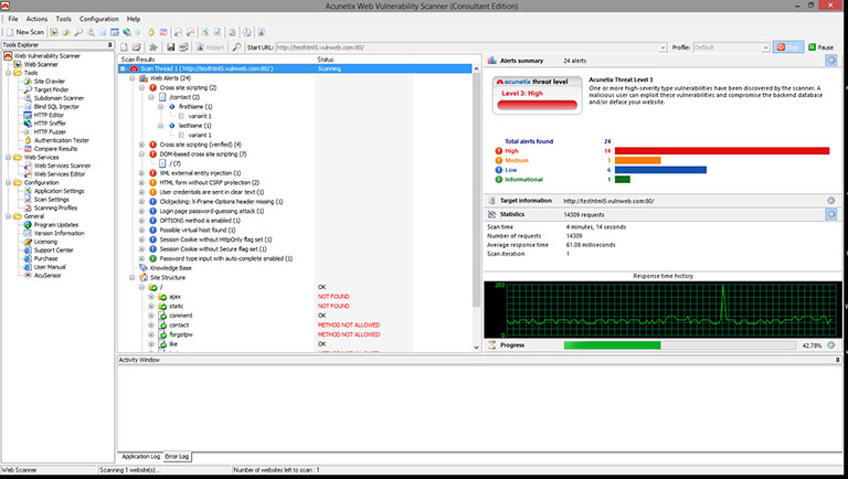 "El escáner de Vulnerabilidades Web de Acunetix es Una herramienta de seguridad de aplicaciones Web automatizada. Acunetix WVS automatiza la tediosa tarea de pruebas manuales.